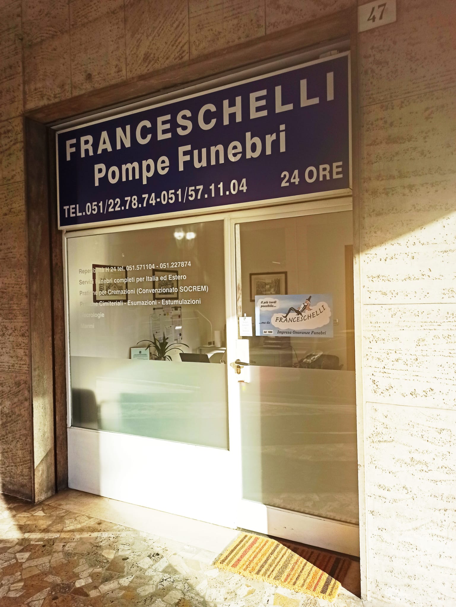 Dal 1866, le Onoranze Funebri Franceschelli hanno affiancato le famiglie di Bologna dell'organizzazione dei funerali, offrendo un supporto completo ed affidabile. La premiata ditta di pompe funebri, reperibile 24 ore su 24 ogni giorno dell'anno, cura ogni dettaglio delle cerimonie di esequie, offrendo anche alcune vantaggiose convenzioni ai propri clienti.